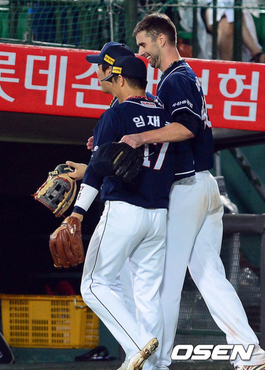 24일 오후 부산 사직구장에서 열린 '2012 팔도 프로야구' 롯데 자이언츠와 두산 베어스의 경기 5회말 종료 후 니퍼트가 임재철과 함께 덕아웃으로 향하고 있다.