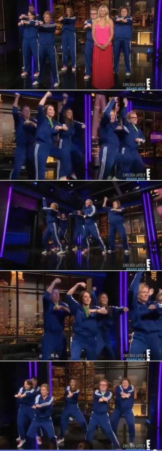 이어 "유투브에서는 4300만명이 봤다"는 소개 멘트와 함께 '강남스타일' 뮤직비디오의 하이라이트가 보여졌고, 스튜디오에는 파란색 추리닝을 입은 여섯명의 크루가 등장했다. 첼시가 한국말로 "오빠 강남스타일!"이라며 외치자 크루는 단체로 '강남스타일'의 포인트 안무인 '말춤'을 추기 시작해 폭소를 안겼다.