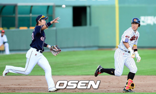 25일 오후 부산 사직구장에서 열린 '2012 팔도 프로야구' 롯데 자이언츠와 두산 베어스의 경기 3회말 2사 전준우가 좌중간 2루타를 친 후 3루까지 쇄도, 협살에 걸려 도망가고 있다.