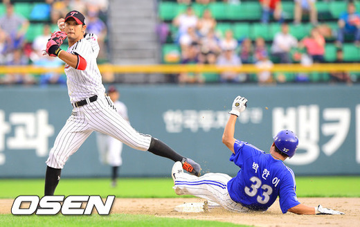 25일 오후 서울 잠실구장에서 열린 '2012 팔도 프로야구' LG 트윈스와 삼성 라이온즈의 경기 3회초 1사 1루 삼성 이승엽의 내야땅볼을 LG 서동욱 2루수가 1루주자 박한이를 포스아웃 시킨후 병살시도하고 있다. 타자 이승엽은 세이프.