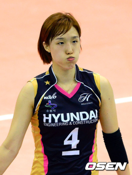 25일 오후 수원실내체육관에서 열린 'KOVO 2012 수원컵 프로배구대회' 여자부 준결승전 현대 건설과 GS 칼텍스의 경기, 2세트 현대 황연주가 득점에 실패하고 아쉬운듯 볼에 바람을 불어넣고 있다.