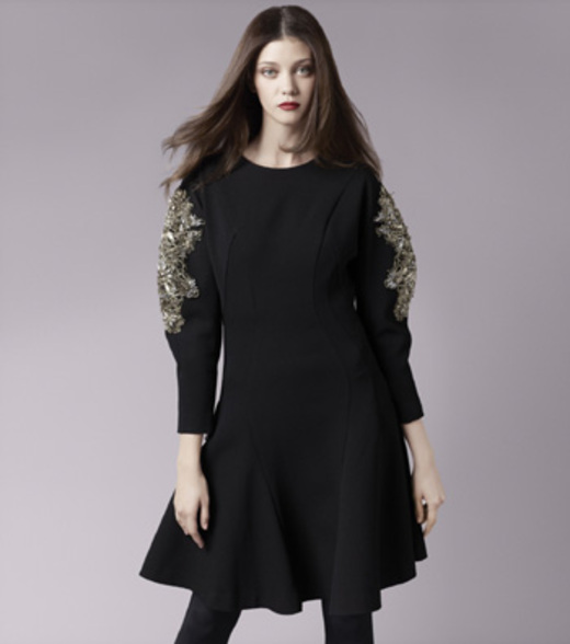 정교한 슬리브 비딩 장식은 엘레강스 무드의 레이디 라이크 룩 스타일링을 연출하기 좋다. 뿐만 아니라 프린세스 라인의 패턴으로 날씬한 바디라인을 강조했으며, 고급스러운 텍스처의 모직 소재를 사용해 드라마틱한 A라인 실루엣의 자연스러운 스커트 모양을 부각시켰다.