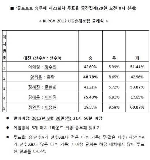 국민체육진흥공단(www.kspo.or.kr)이 발행하는 체육진흥투표권 수탁사업자인 스포츠토토 공식 온라인 발매 사이트인 베트맨(www.betman.co.kr)은 31일 포천 일동레이크에서 열리는 'KLPGA 2012 LIG손해보험 클래식' 1라운드를 대상으로 한 승무패 21회차 게임을 중간집계한 결과, 4매치(김혜윤-이미림)에서 김혜윤 승리 예상이 75.43%로 가장 높게 집계됐다고 밝혔다.