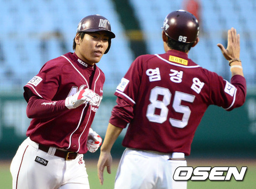 29일 오후 대전 한밭야구장에서 열린 '2012 팔도 프로야구' 한화 이글스와 넥센 히어로즈의 경기, 1회초 1사 2루 넥센 강정호가 좌월 선제 투런홈런을 치고 염경엽 코치와 하이파이브를 하고 있다.