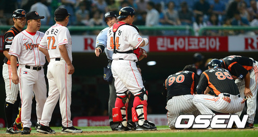 29일 오후 인천 문학구장에서 열린 '2012 팔도 프로야구' SK 와이번스와 롯데 자이언츠의 경기 3회초 선두타자 문규현이 부시의 투구에 몸을 맞자 이만수 감독이 걱정스런 표정으로 쳐다보고 있다.