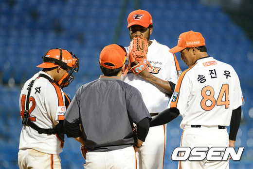 29일 오후 대전 한밭야구장에서 열린 '2012 팔도 프로야구' 한화 이글스와 넥센 히어로즈의 경기, 2회초 무사 만루 마운드에 방문한 한화 송진우 코치가 바티스타와 이야기를 나누고 있다.