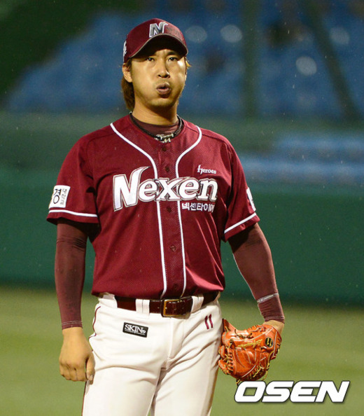 29일 오후 대전 한밭야구장에서 열린 '2012 팔도 프로야구' 한화 이글스와 넥센 히어로즈의 경기, 7회말 무사 1,3루 넥센 이정훈이 한화 이대수 타석때 큰 숨을 쉬고 있다.