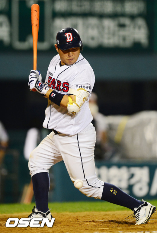29일 오후 서울 잠실구장에서 열린 '2012 팔도 프로야구' 두산 베어스와 LG 트윈스의 경기에서 7회말 2사 주자 없는 상황에서 두산 양의지가 다리에 볼을 맞고 있다.
