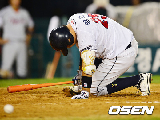 29일 오후 서울 잠실구장에서 열린 '2012 팔도 프로야구' 두산 베어스와 LG 트윈스의 경기에서 7회말 2사 주자 없는 상황에서 두산 양의지가 다리에 볼을 맞고 고통스러워 하고 있다.