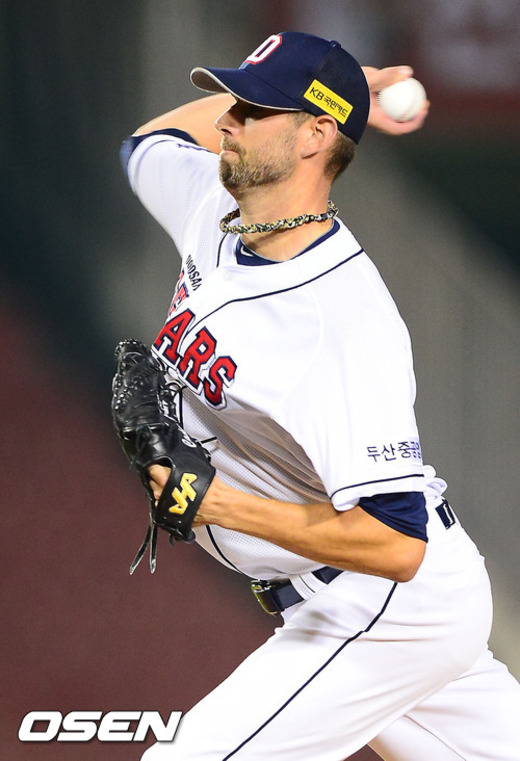 29일 오후 서울 잠실구장에서 열린 '2012 팔도 프로야구' 두산 베어스와 LG 트윈스의 경기에서 8회초 교체 투입된 니퍼트가 힘차게 공을 뿌리고 있다.