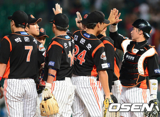 29일 오후 인천 문학구장에서 열린 '2012 팔도 프로야구' SK 와이번스와 롯데 자이언츠의 경기 종료 후 롯데 선수들이 하이파이브를 하고 있다.