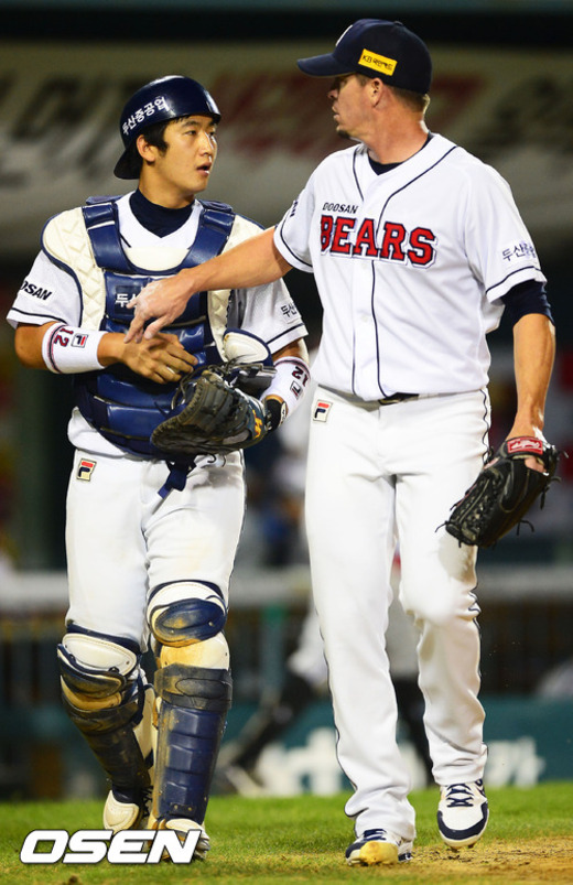 29일 오후 서울 잠실구장에서 열린 '2012 팔도 프로야구' 두산 베어스와 LG 트윈스의 경기에서 9회초를 마무리한 후 프록터와 최재훈 포수가 얘기를 나누고 있다.