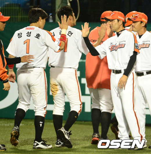 경기 종료 후 한화 한용덕 감독대행이 장성호와 승리의 기쁨을 나누고 있다. / sunday@osen.co.kr