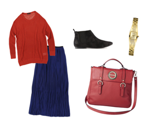 니트와 함께 바람결에 흩날리는 롱스커트를 매치하면 은근한 여성미까지 더해져 매력적인 캠퍼스 룩을 연출할 수 있다. 여기에 골드컬러 시계로 고급스러움을 더하고 블랙 슈즈를 매치하면 패셔너블한 분위기를 고조시킬 수 있다.