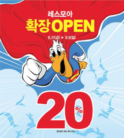 레스모아는 강릉점 새단장 오픈을 맞아 31일부터 9월 9일까지 총 10일간 가을 신상품을 포함한 전 품목을 20% 할인된 가격에 제공한다. 특히 선착순으로 리복, 아디다스, 나이키 등의 유명 브랜드 제품을 최저가 22,500원부터 만나볼 수 있는 초특가전을 진행한다.