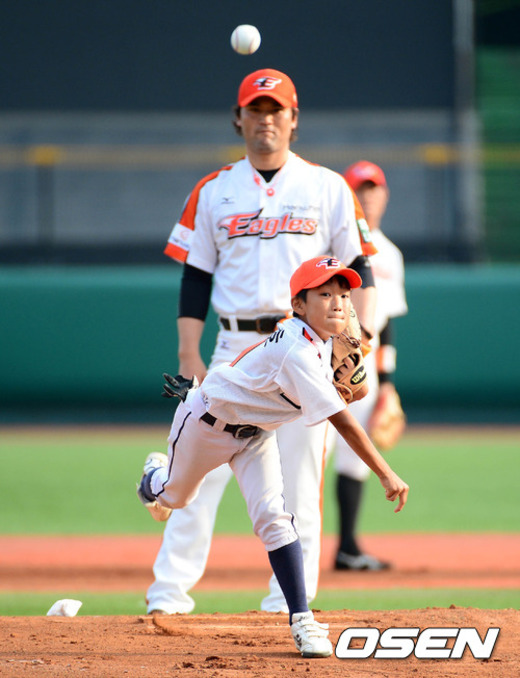 2일 오후 대전 한밭야구장에서 열린 '2012 팔도 프로야구' 한화 이글스와 KIA 타이거즈의 경기에 앞서 한화 박찬호가 조카인 공주 중동초등학교 야구부 박성호 군이 시구를 하고 있다.