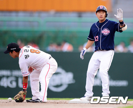 2일 오후 인천 문학구장에서 열린 '2012 팔도 프로야구' SK 와이번스와 두산 베어스의 경기, 4회초 1사에서 두산 손시헌이 담장을 맞추는 좌중간 2루타를 날리고 2루에 안착하며 타임을 외치고 있다.