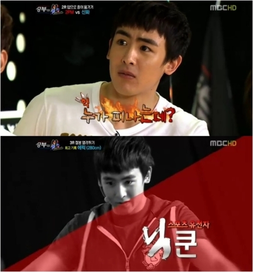 2일 오후 방송된 ‘승부의 신’은 신화와 2PM이 쌍절곤으로 촛불 끄기, 입으로 종이 옮기기, 철봉 멀리뛰기 대결을 펼쳤는데 모든 멤버가 참여하는 경기 특성상 닉쿤이 간간히 나왔다.