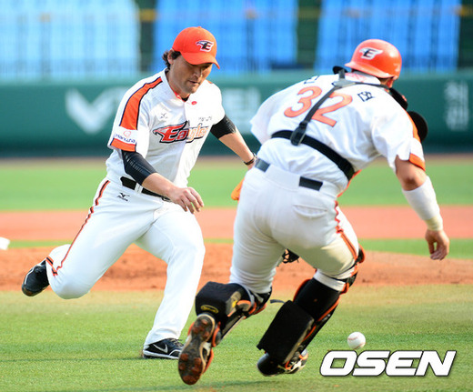 2일 오후 대전 한밭야구장에서 열린 '2012 팔도 프로야구' 한화 이글스와 KIA 타이거즈의 경기, 1회초 1사 2,3루 한화 박찬호가 KIA 안치홍의 땅볼 타구를 잡으려하고 있다.