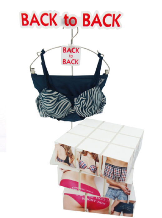 또한 '백투백 라인'의 가장 중요한 점은 크로스코디가 된다는 점이다. 이러한 부분을 소비자에게 직접적으로 보여주기 위하여 시도한 디스플레이 방식에도 주목할 만 하다. 시즌별 SI(Shop Identity)를 시즌 콘셉트와 정확하게 매치하여 소비자에게 더 정확하고 많은 정보를 빠른 시간 내에 전달하기에 적합하도록 백투백 라인 전용 디스플레이 집기는 여러 개의 큐브로 구성되어 각 상자마다 크로스코디가 가능한 상품군을 보여주며, 실제품의 연출까지 더하여 실 착장하여 확인하기 어려운 언더웨어의 특성을 참신한 방식으로 풀어냈다.