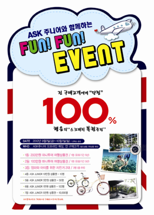 전국 애스크 주니어 전국 매장에서 진행되는 ‘스크래치 복권’ 경품 이벤트는 전 구매고객에게 100% 당첨 기회의 스크래치 복권을 선착순으로 증정한다. 이벤트 경품으로 여가 활동에 대한 관심이 높아지는 가을을 맞아 온 가족이 누릴 수 있는 하나투어 200만원 여행상품권(1명), 하나투어 100만원 여행상품권(1명)과 엄마와 아이가 함께 레포츠를 즐길 수 있는 커플 자전거 2대(3명) 이외에 총 10,200명에게는 매장에서 바로 사용할 수 있는 다양한 금액대의 상품권이 주어진다.