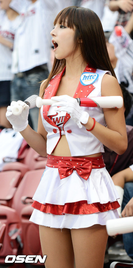9일 오후 서울 잠실구장에서 열린 '2012 팔도 프로야구' LG 트윈스와 KIA 타이거즈의 경기에서 LG 치어리더 강윤이가 경기를 주시하며 입을 벌리고 있다.