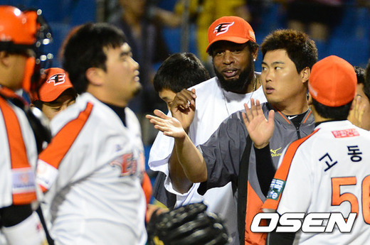 경기후 한화 승리투수 바티스타가 안승민을 바라보며 즐거워하고 있다./jpnews@osen.co.kr