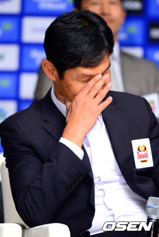 13일 오전 서울 아산청책연구원에서 진행된 '2012 K리그 스플릿 시스템 그룹A'(서울, 전북, 수원, 울산, 포항, 부산, 제주, 경남) 기자회견에서 사회자의 질문에 서울 최용수 감독이 당황스러운듯한 표정을 짓고 있다.