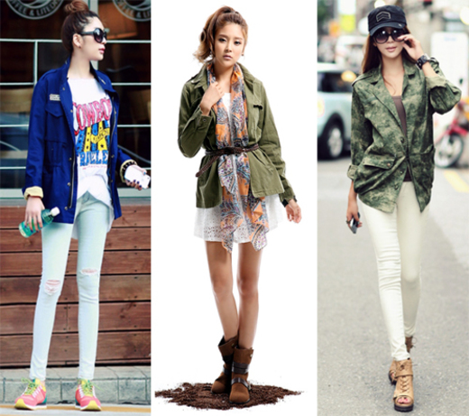 이번 시즌은 카무플라주 패턴의 야상이 유행이다. 밀러터리룩이라 불리는 아이템으로 군복에 쓰이는 패턴을 활용한 것이다. 이는 남성성이 강하기 때문에 잘못 코디하면 너무 강해보이거나 촌스러워질 수 있다. 이때는 니트나 레이스, 쉬폰 소재로 된 원피스를 매치하면 한결 부드럽게 스타일이 완성된다.