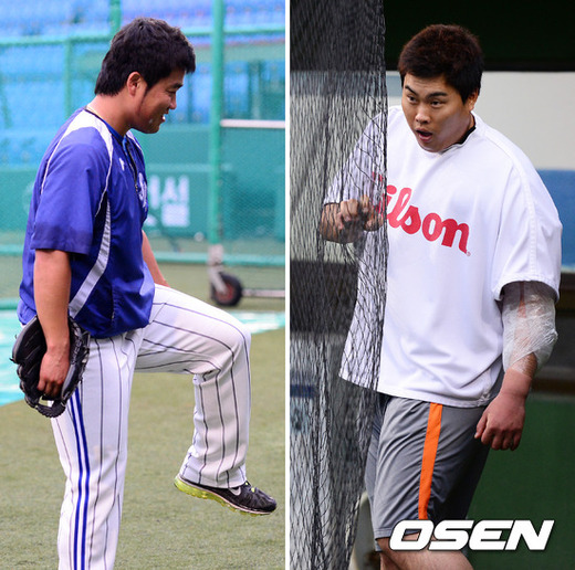 13일 오후 대전구장에서 열린 '2012 팔도 프로야구' 한화 이글스와 삼성 라이온즈의 경기, 경기에 앞서 한화 류현진이 삼성 훈련을 지켜보며 지난 12일 경기서 사구를 허용한 박석민과 이야기를 나누고 있다.