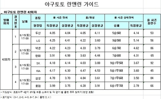 두산-LG, 넥센-한화, SK-KIA, 삼성-롯데 전을 대상으로 진행되는 야구토토 런앤런 42회차 게임은 경기시작 10분 전인 15일 오후 4시 50분에 발매가 마감된다.