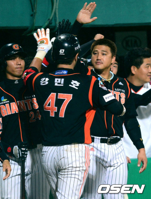 14일 오후 광주 무등구장에서 열린 '2012 팔도 프로야구' KIA 타이거즈와 롯데 자이언츠의 더블헤더 2차전 경기 8회초 선두타자 강민호가 솔로포를 친 후 동료들과 하이파이브를 하고 있다.