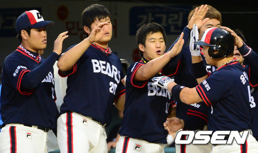 16일 오후 서울 잠실구장에서 열린 '2012 팔도 프로야구' 두산 베이스와 LG 트윈스의 경기, 3회말 1사 1루에서 두산 윤석민이 투런포를 날리고 더그아웃에서 동료선수들의 축하를 받고 있다.