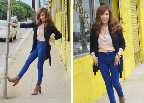 최근 한 온라인 커뮤니티에 ‘LA에서 소시 티파니 포착’라는 제목의 게시물이 올라왔다. 사진 속 티파니는 선명한 블루 컬러 스키니 진에 여성스러움이 물씬 풍기는 다트 무늬 셔츠와 카디건을 걸쳐 패셔니스타다운 면모를 과시했다. 블루는 여름을 상징하는 컬러이지만 핑크빛 셔츠와 네이비 카디건의 컬러매치가 오히려 더욱 가을 분위기를 연출해 준다.
