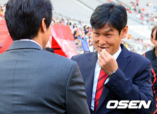 22일 오후 서울월드컵경기장에서 벌어진 '현대오일뱅크 K리그 2012' 32라운드 경기 FC 서울과 포항 스틸러스의 경기전 최용수 서울 감독과 황선홍 포항감독이 악수를 나누고 있다.