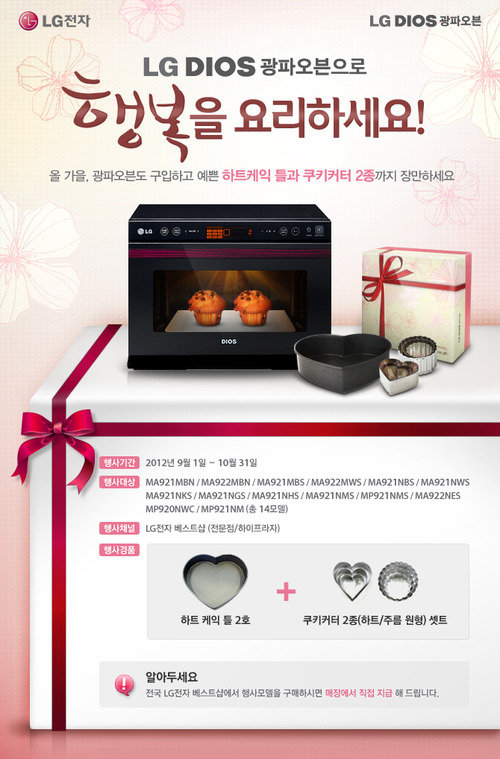 이벤트 기간 중 LG전자 베스트샵에서 프리미엄 디오스 광파오븐 행사모델을 구입하면 하트 모양으로 케이크를 구울 수 있는 하트 케이크 틀, 쿠키커터 2종(하트/주름원형) 세트를 증정한다. 처음 오븐을 구매하는 예비 신랑신부나 신혼부부에게 유용할 것으로 보인다.
