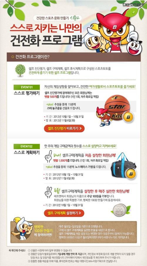 이번 캠페인 동안 셀프진단평가에 참여한 모든 회원과 셀프구매계획을 처음 설정한 회원들에게는 각각 벳볼 500개와 1,000개를 적립해주고, 추첨을 통해 농구공(15명)과 스포츠가방(15명)을 증정한다.