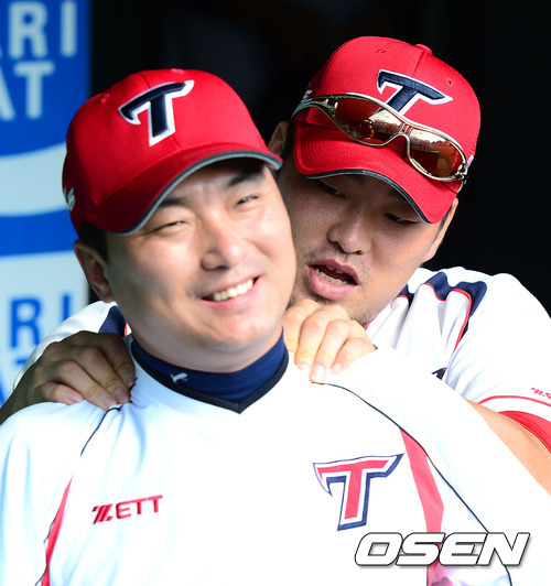 3일 오후 대전 한밭야구장에서 열린 '2012 팔도 프로야구' 한화 이글스와 KIA 타이거즈의 경기에 앞서 KIA 김진우가 정회열 코치에게 안마를 해주고 있다.