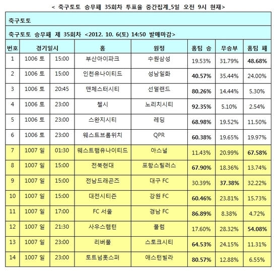 축구토토 승무패 35회차 투표율 중간집계 결과