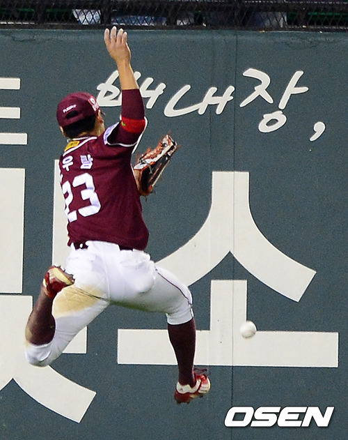 5일 오후 서울 잠실구장에서 열린 '2012 팔도 프로야구' 두산 베어스와 넥센 히어로즈의 경기, 3회말 무사에서 넥센 문우람이 두산 임재철의 타구에 몸을 날렸으나 놓칙 있다. 임재철은 2루타.