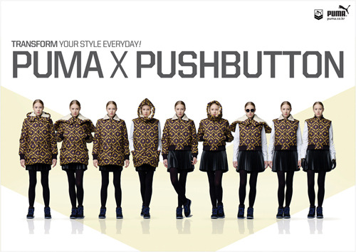 푸마ⅹ푸시버튼 트랜스포머 자켓은 팔과 허리, 후드 부분이 지퍼로 연결돼있어 부분별로 탈부착을 통해 총 9가지의 다양한 스타일을 연출할 수 있는 겨울 점퍼이다. 독특한 프린트를 스타일리시하게 활용하는 것으로 잘 알려진 푸시버튼은 이번 컬렉션에서 푸마의 로고를 활용한 블랙-옐로 프린트로 시크함을 강조했다.