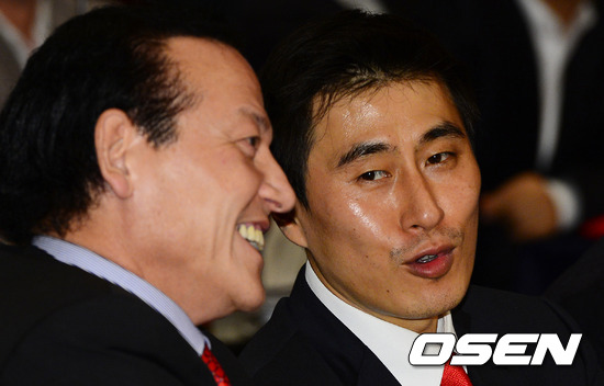 삼성 김동광 감독과 이상민 코치가 드래프트 2순위로 결정된 후 이야기를 나누고 있다.