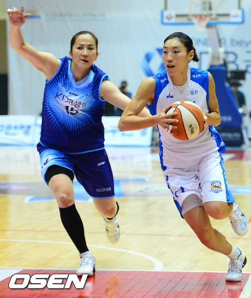 12일 오후 구리시체육관에서 열린 ‘KDB금융그룹 2012-2013 여자프로농구’ KDB생명과 우리은행의 공식 개막전에서 1쿼터 우리은행 임영희가 KDB생명 신정자를 돌파하고 있다.
