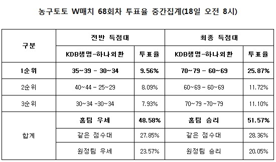 전반전에서도 KDB생명 우세(48.58%) 예상이 1순위로 집계됐고, 양팀 같은 점수대 예상(27.85)와하나외환 우세(23.57%) 예상이 뒤를 이었다. 전반 득점대 예상은 KDB생명 35~39, 하나외환 30~34점대 예상이 9.56%로 최다 집계됐고, 최종 득점대 예상에서도 KDB생명 70~79, 하나외환 60~69점대 예상(25.87%)이 최다 집계됐다.
