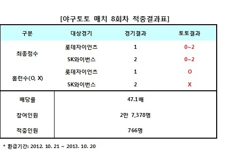 플레이오프 시리즈 전적 1승 2패로 롯데에 뒤졌던 SK는 선발 마리오의 눈부신 호투와 정근우, 박재상의 활약을 앞세워 롯데에 2-1로 신승을 거뒀다. SK는 홈런을 기록하지 못했고, 롯데는 홍성흔의 솔로홈런을 기록했다. 야구토토 매치 8회차 최종 적중결과는 SK 홈런 ‘X’, 최종점수대 ‘0~2’, 롯데 홈런 ‘O’, 최종점수대 ‘0~2’로 나타났다. 적중자 가운데 최대 베팅금액인 6만원을 베팅한 1명의 야구팬은 이번 회차 최고액인 282만 6,000원의 적중상금을 받게 됐고, 최소 베팅금액인 100원을 베팅한 99명의 적중자들에게는 각각 4,710원씩 환급금이 주어진다.