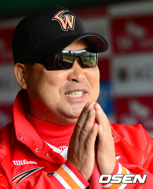 28일 오후 인천 문학구장에서 열린 2012 팔도 프로야구 삼성 라이온즈와 SK 와이번스의 한국시리즈 3차전, 경기에 앞서 SK 이만수 감독이 취재진과 이야기를 나누며 선발 투수 부시가 잘 던져주길 바라는 마음으로 기도 포즈를 취하고 있다.