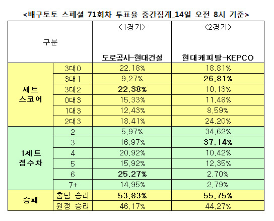 국민체육진흥공단(www.kspo.or.kr)이 발행하는 체육진흥투표권 수탁사업자인 스포츠토토 공식 온라인 발매사이트 베트맨(www.betman.co.kr)이 오는 15일 열리는 2012-13시즌 국내프로배구(V리그)를 대상으로 한 배구토토 스페셜 71회차 투표율 중간집계 결과, 국내 배구팬 55.75%는 현대캐피탈-KEPCO(2경기)전에서 현대캐피탈의 승리를 전망했다고 밝혔다.
