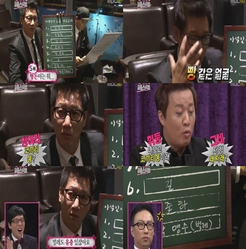 지석진은 자신이 정한 순위를 설명하면서 “정형돈은 이목구비가 없는 거나 마찬가지다. 꼭 빵같이 생겼다”고 냉정하게(?) 평가했고 “정준하는 코끼리똥을 닮았다”며 독특한 설명을 해 웃음을 자아냈다.