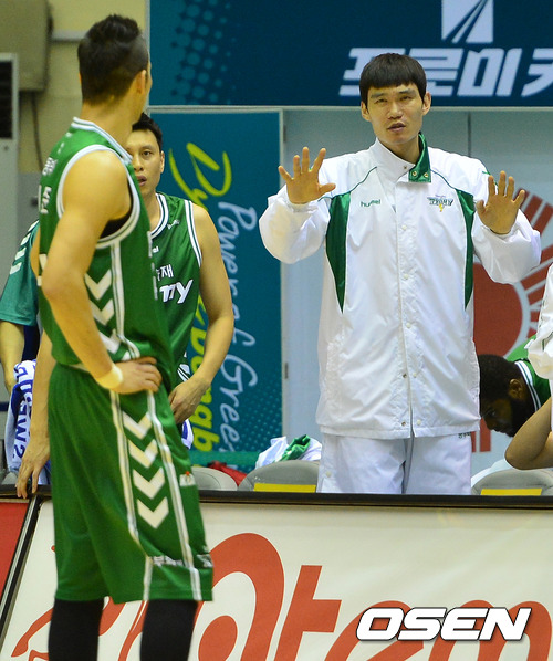2쿼터 출전 명단에서 제외된 동부 김주성이 벤치에서 이승준을 독려하고 있다.