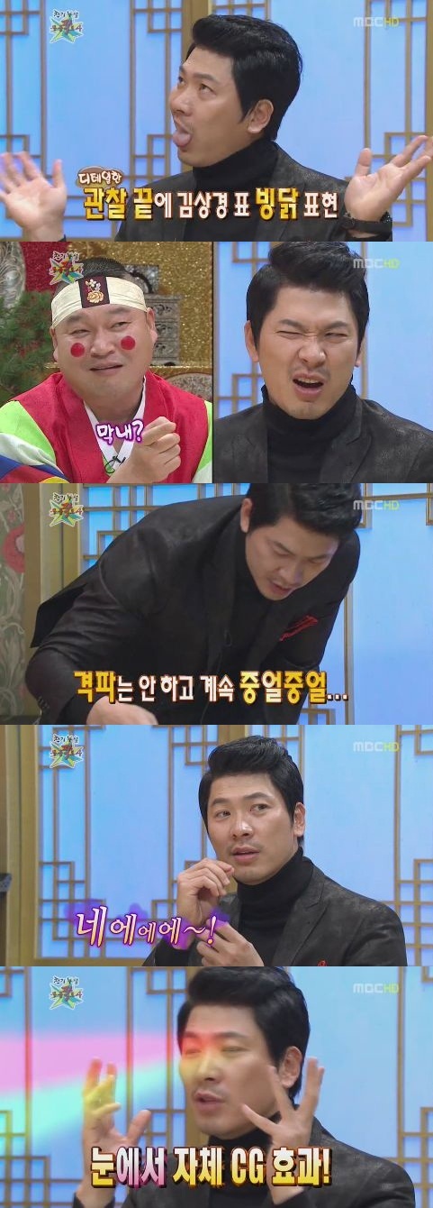 이날 ‘무릎팍도사’는 최근 김상경이 케이블채널 tvN ‘SNL 코리아’에서 선보인 빙닭(빙어+닭) 연기 얘기로 시작됐다. 강호동이 빙닭 연기를 요청하자 “정우성 씨는 마지막에 망가지던데 초장부터 어떻게 하냐”며 “빙닭도 연구와 몰입으로 완성됐다”고 말했다.